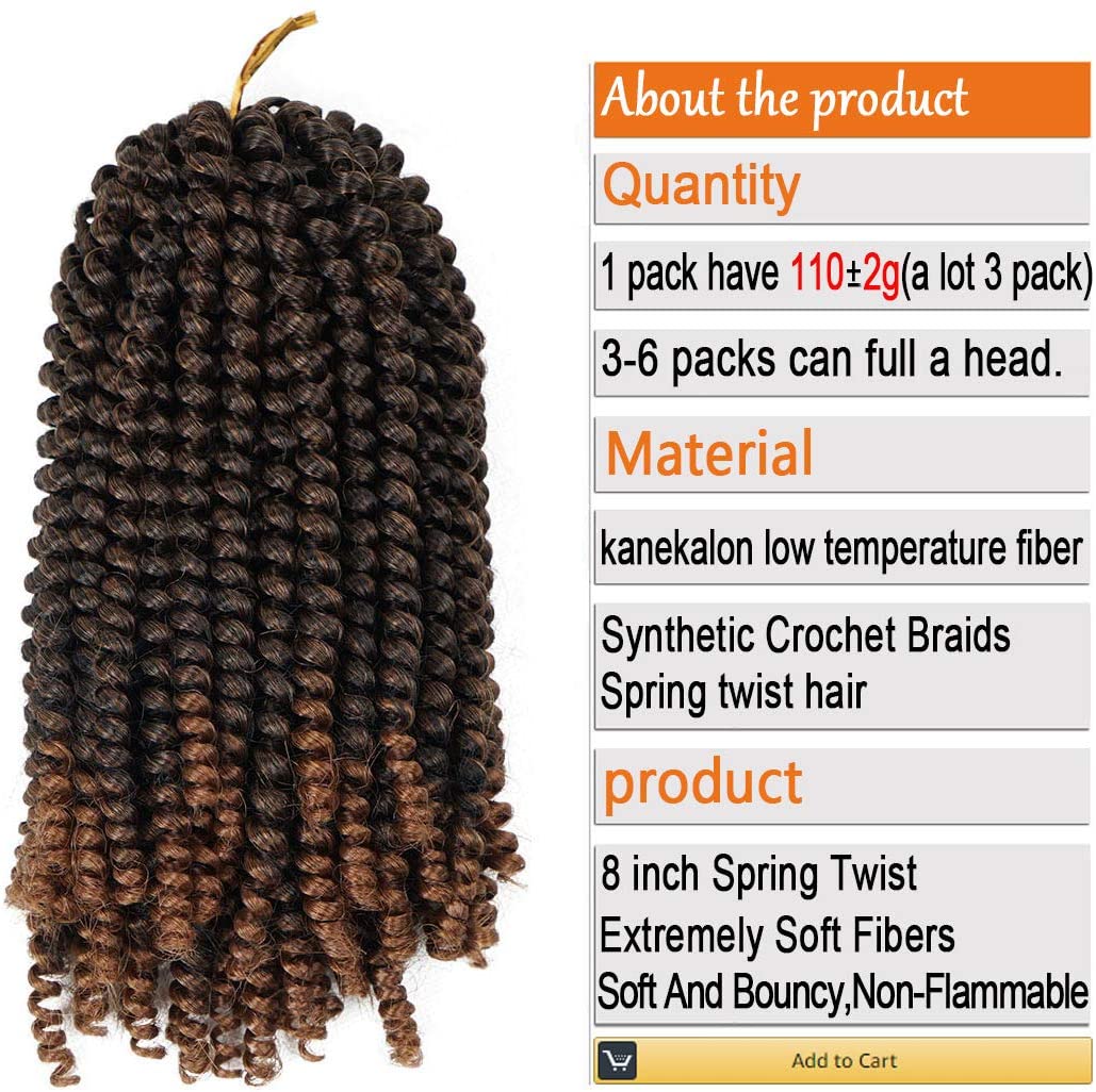 - Hair Material:kanekalon Hair, 100% Kanekalon Hair Extensions, 8 inch Spring Twist